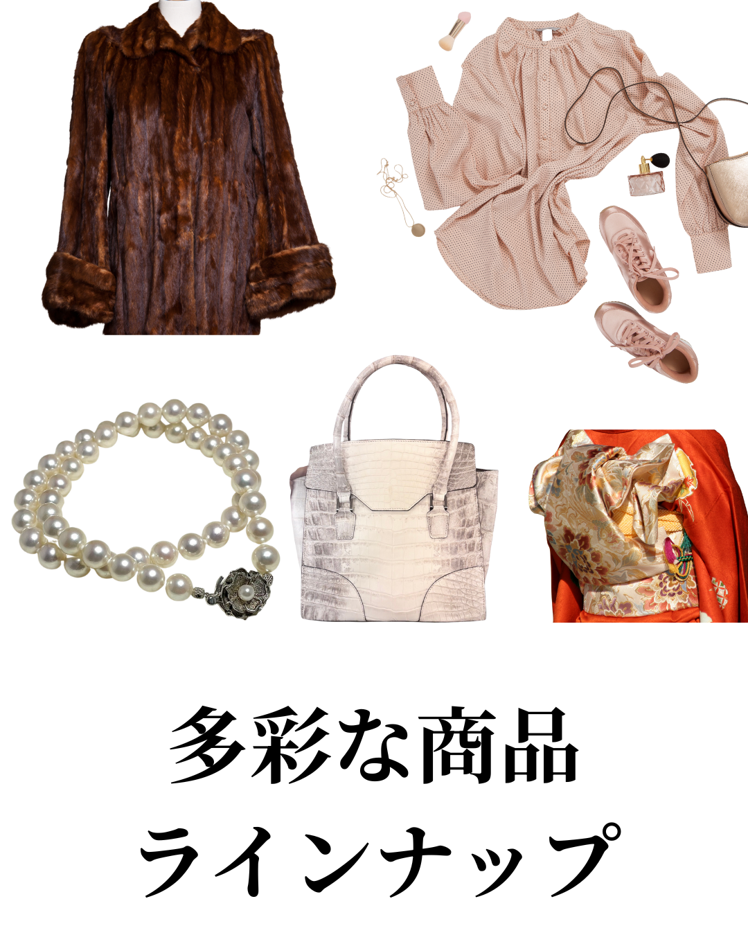 初心者向けのアパレルから、毛皮/クロコ/着物/パールなど専門性の高い商品まで豊富取り揃えています。